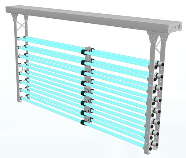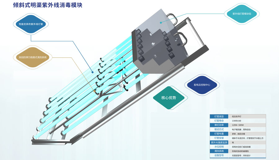 (5)特殊的設(shè)計(jì)便于設(shè)備維護(hù),更換燈管快速且容易,無需把整個(gè)消毒模塊提出水面。